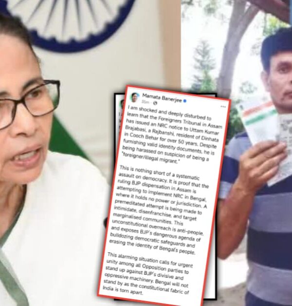 নিজের সোশ্যাল হ্যান্ডেলে এদিন মুখ্যমন্ত্রী লেখেন, ”আমি হতবাক ও অত্যন্ত বিচলিত হয়েছি জেনে যে, কোচবিহারের দিনহাটার বাসিন্দা রাজবংশী সম্প্রদায়ের উত্তম কুমার ব্রজবাসীকে অসমের ফরেনার্স ট্রাইবুনাল, এনআরসি নোটিশ জারি করেছে। গত ৫০ বছরেরও বেশি সময় ধরে তিনি এই বাংলার বাসিন্দা। তাঁর বৈধ পরিচয়পত্র থাকা সত্ত্বেও, তাঁকে “বিদেশি/অবৈধ অনুপ্রবেশকারী” সন্দেহে হয়রানি করা হচ্ছে।