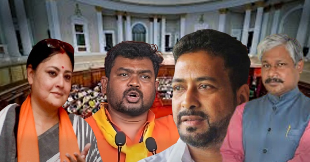 সোমবার বিধানসভায় তুমুল বিক্ষোভ দেখাল পদ্ম নেতারা। এর ফলে অগ্নিমিত্রা পল, মনোজ ওঁরাও, দীপক বর্মন, শংকর ঘোষকে পুরো অধিবেশনের জন্য সাসপেন্ড করে দেওয়া হল। মার্শালের সঙ্গে রীতিমত হাতাহাতিতে জড়িয়ে পড়ায় মনোজ ওঁরাওকে পাঁজাকোলা করে বিধানসভায় থেকে বের করলেন মার্শাল। গত সোমবারও অধিবেশন চলাকালীন সাসপেন্ড হয়েছিলেন বিজেপি বিধায়ক মনোজ ওঁরাও। সোমবার অধিবেশন চলাকালীন বিজেপি বিধায়কদের বক্তব্য কেন মুছে ফেলা হয়েছে সেই প্রশ্ন তোলেন বিধায়ক অশোক লাহিড়ী। রাজ্যের প্রতিমন্ত্রী চন্দ্রিমা ভট্টাচার্য জানান অধ্যক্ষের সিদ্ধান্তে বিজেপি বিধায়কদের বক্তব্য় মুছে দেওয়া হয়।